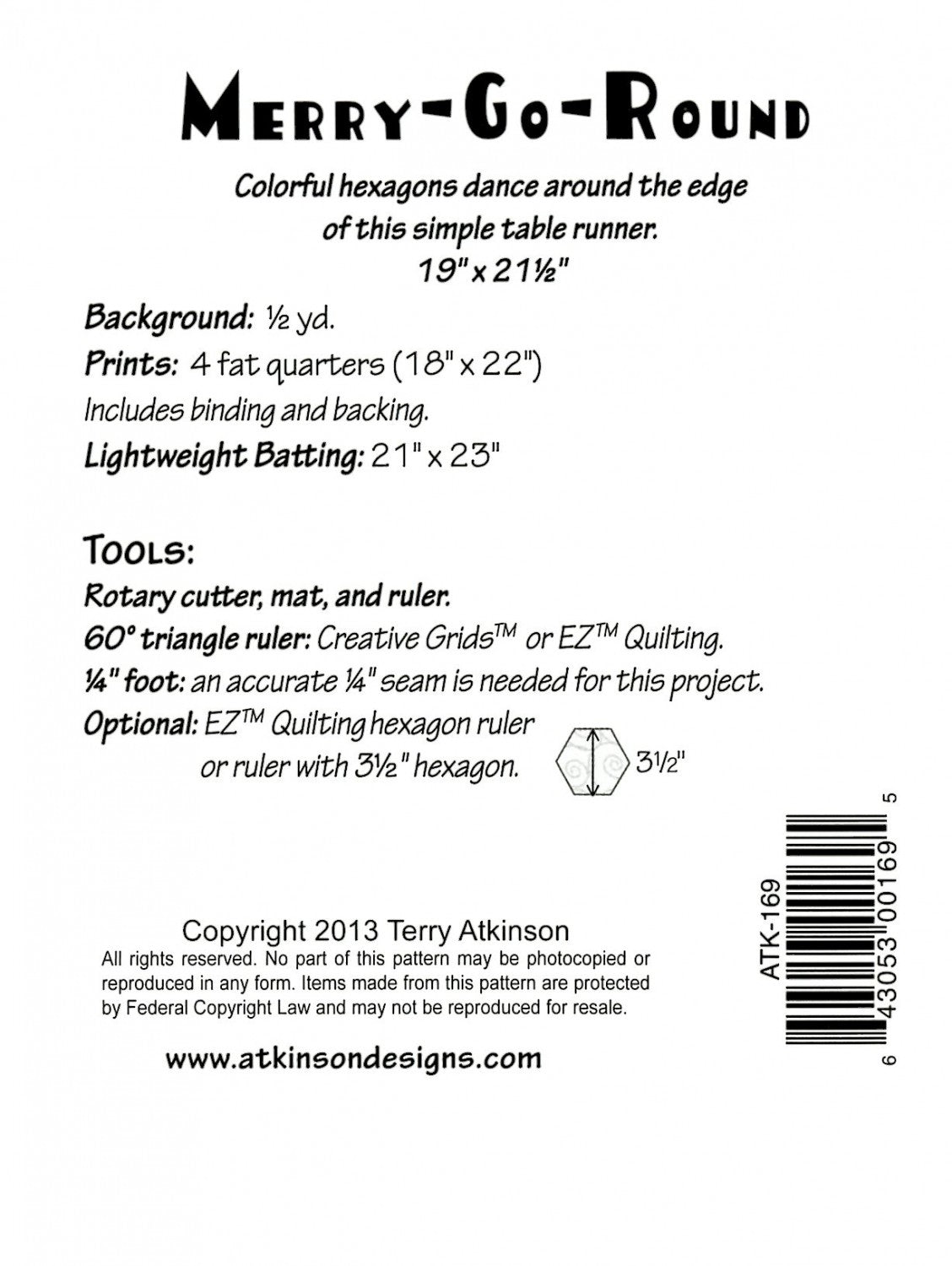 Colorful hexagons dance around the edge of this simple table runner. No "Y" seams, just sew simple rows. Easy to kit! Four fat quarters includes hexies, binding and backing. Uses Creative Grids 60 degree triangle ruler, Instructions show how to cut hexies with or without a hexagon ruler; our testers loved it both ways. Sure to be a hit for your Summer schedule