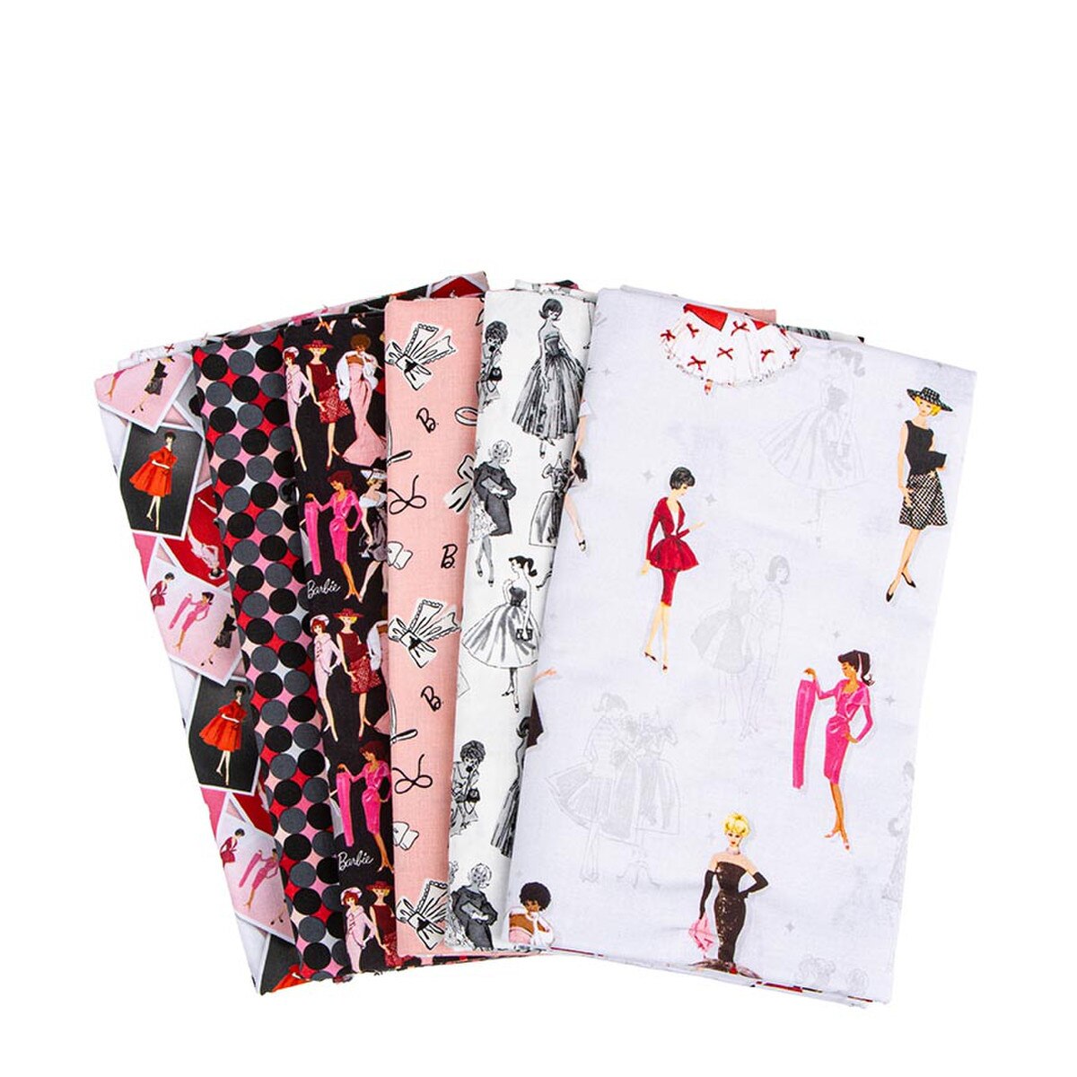 This 1-Yard precut bundle includes a 1-yard piece of each print in the gray colorway (CD16890-GRAY, CD16891-BLACK, C16892-WHITE, C16893-PINK, C16894-BLACK, CD16896-PINK) from the Barbie™ Vintage collection for Riley Blake Designs for a total of 6 yards Official licensed product.