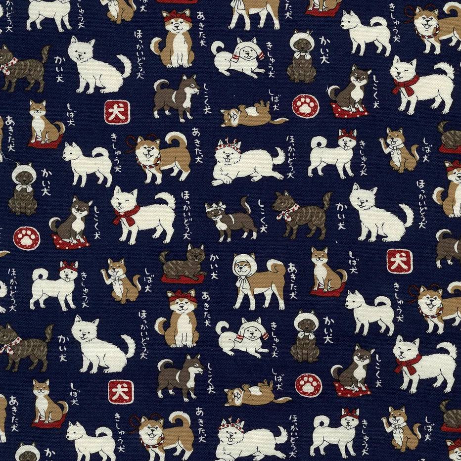 Print: Japanese Dogs Shiba Inu Cotton Oxford - Navy
