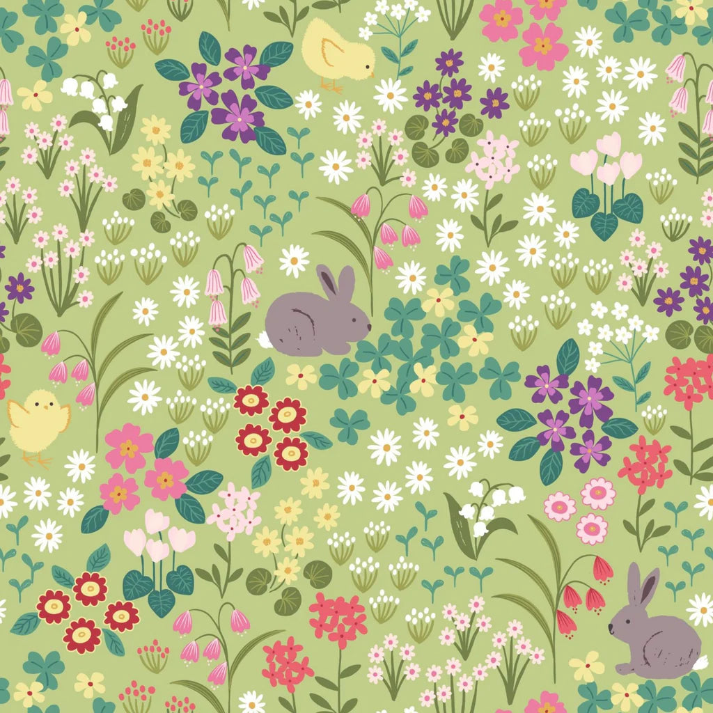Lewis & Irene: Bunny Hop D# A530 C#2 Bunny & Chick Floral on Light Green - Sold by the Half Yard