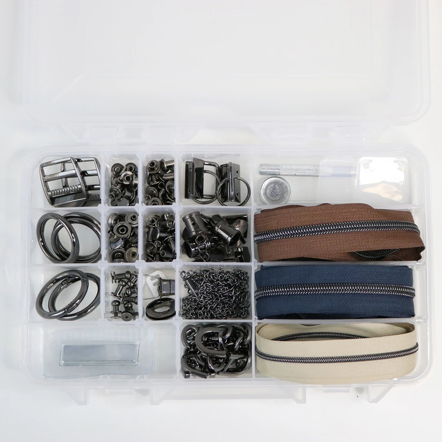 Our Artisan Box Bundle of Essential Hardware and Zippers comes in five finishes, nickel, gold, antique, gunmetal, and rose gold. Choose the boxed set with the color you use the most, or get multiple boxes to grow your stash of bling!