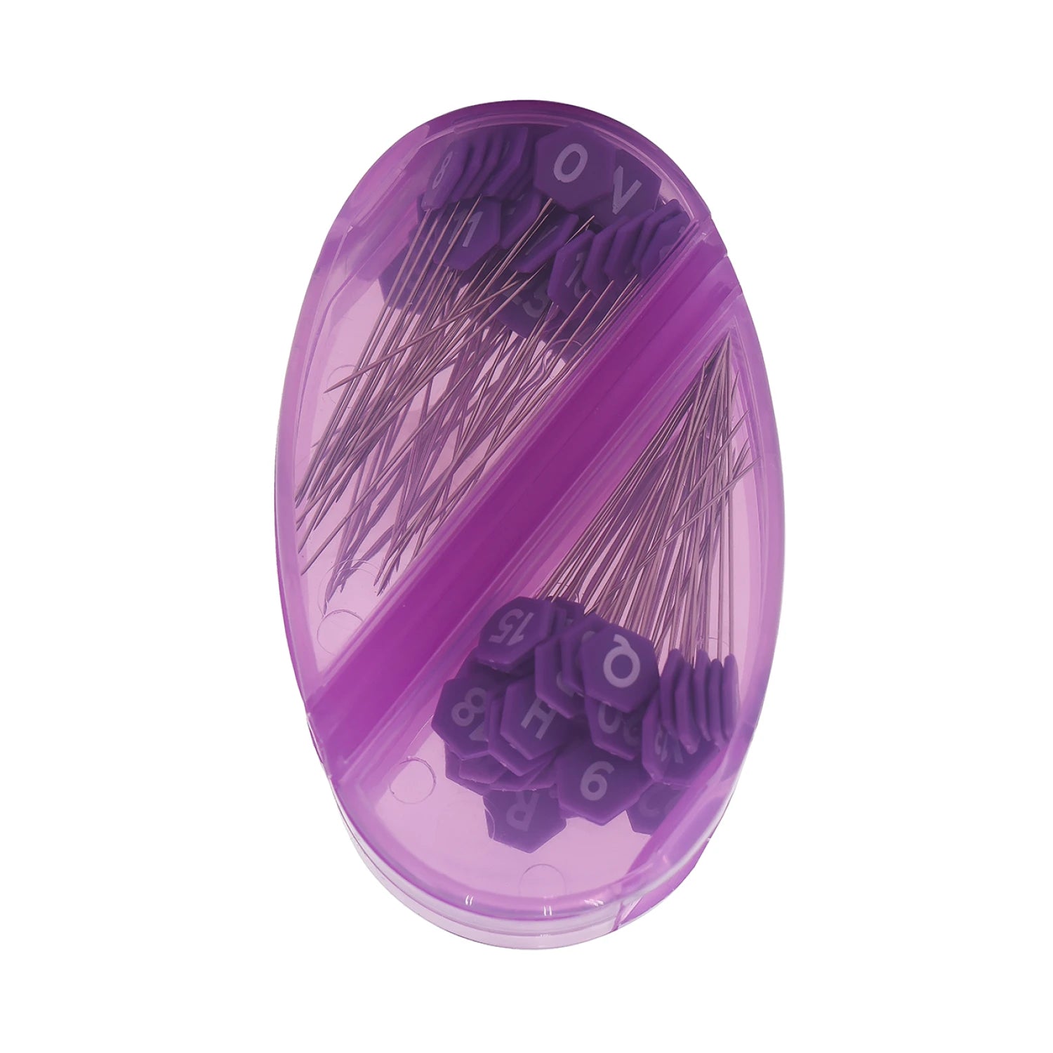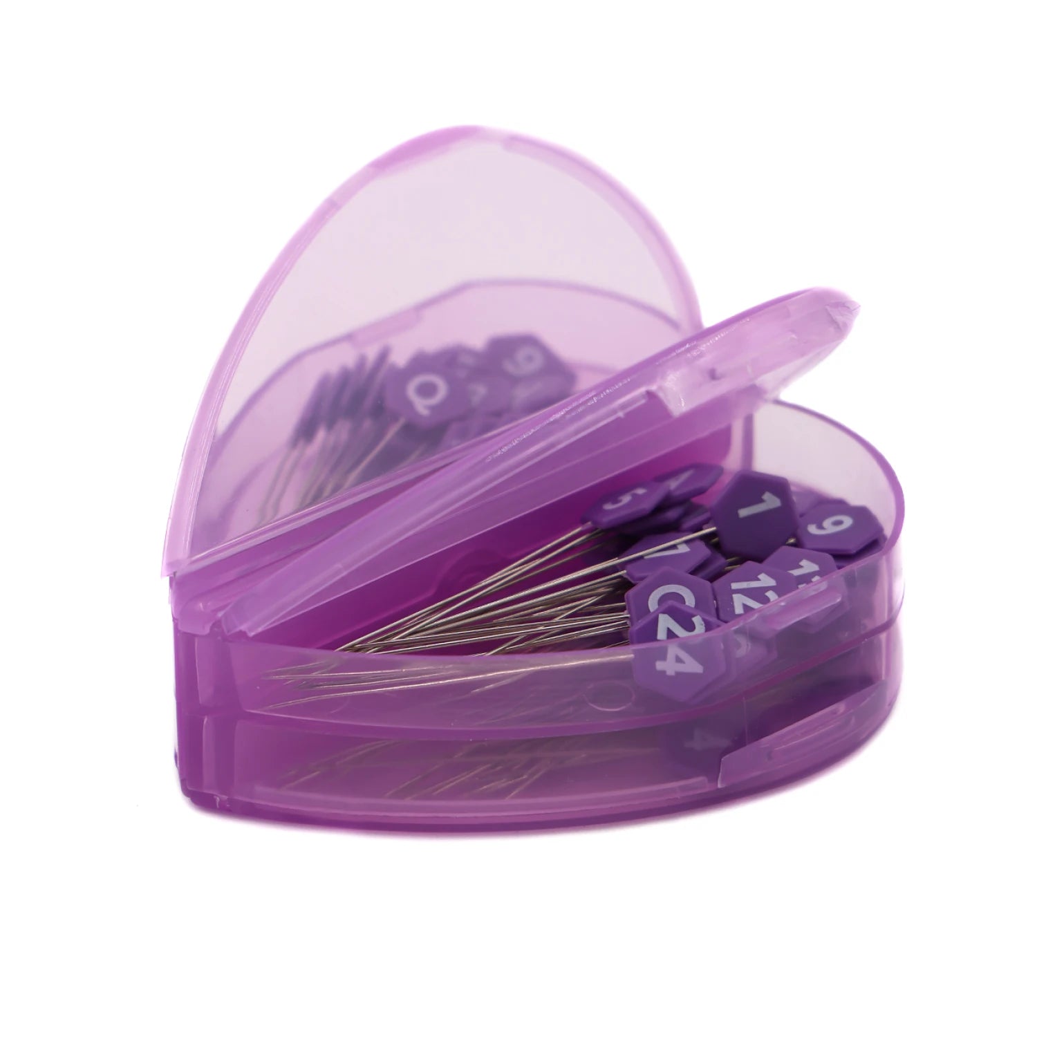 Numbered (0-25) on one side and lettered (A-Z) on the other, ABC 123 Cool Pins are perfect for organizing your quilt pieces. At .5mm - these pins are sharp and will never leave holes behind in your fabric. As an added bonus, the pinheads are heat resistant up to 350 degrees Fahrenheit. 104 hexagon shaped pins come in a reusable storage box.