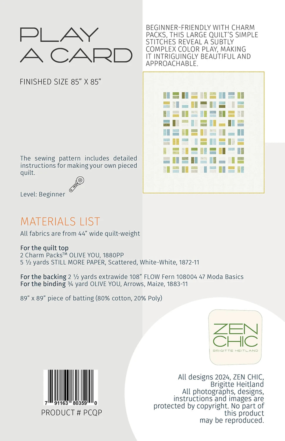 Play a Card Quilt Pattern by Brigette Heitland of Zen Chic - PCQP