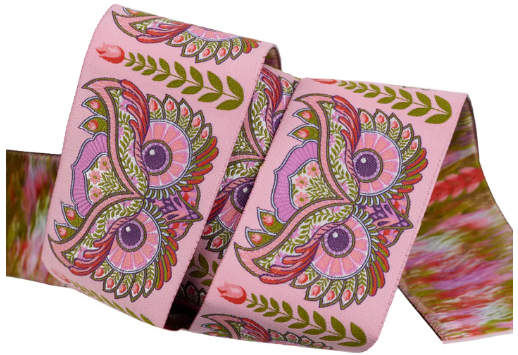 Discover the enchantment of Tula Pink’s Full Moon Forest II with this stunning 2" wide Jacquard Woven Ribbon, exclusively from FreeSpirit Fabrics. Featuring a vibrant pink background, this ribbon is adorned with intricately detailed, ornate owls that capture the essence of whimsical woodland creatures.