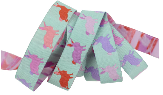 Hop to it with the charming “Hop To It” jacquard woven ribbon from Tula Pink’s Full Moon Forest II collection by FreeSpirit Fabrics. This delightful 5/8" wide ribbon features adorable little bunnies scattered across an aqua background, creating a whimsical quasi-polka dot pattern.