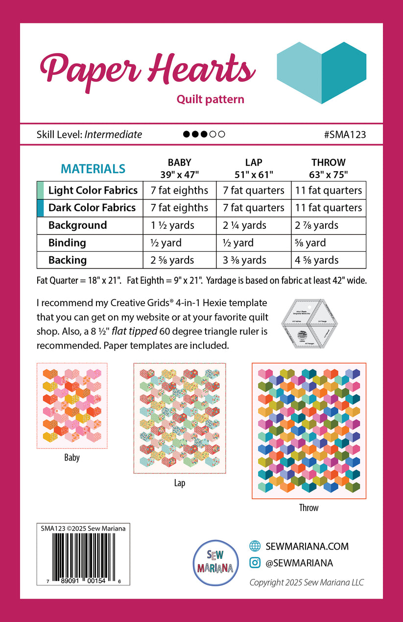 No Y seams! All Sew Mariana Patterns come with full color graphics, detailed cutting directions and step by step instructions to make it easy to follow along. I recommend: 4-in-1 HEXIE template. Also, a 8 flat tipped 60 degree triangle ruler is recommended but not necessary. Paper templates included. Quilt sizes: Baby or Wall, Lap and Throw. See the 2nd image for exact sizes and fabric requirements. Pattern assumes that the quilter has basic piecing and quilting knowledge. Fat quarter friendly.