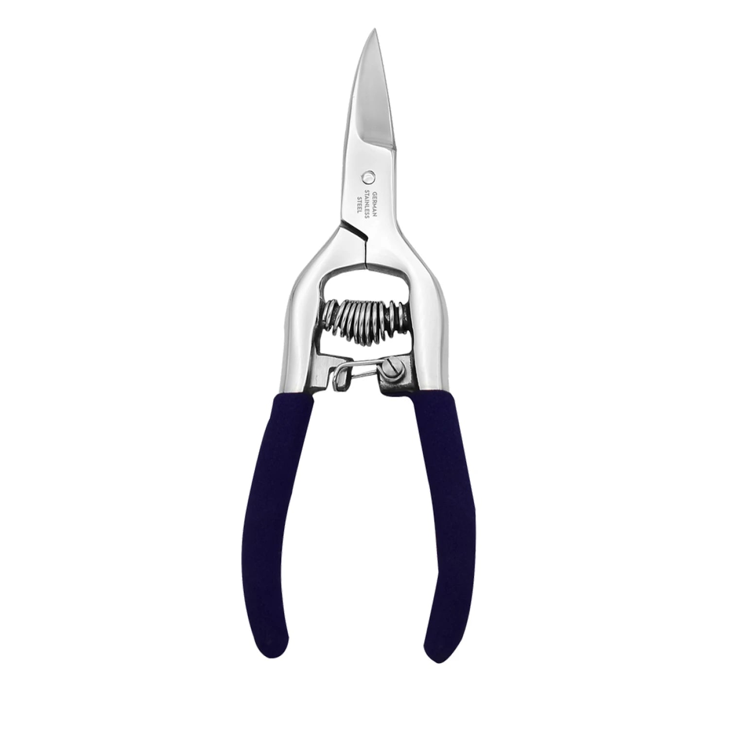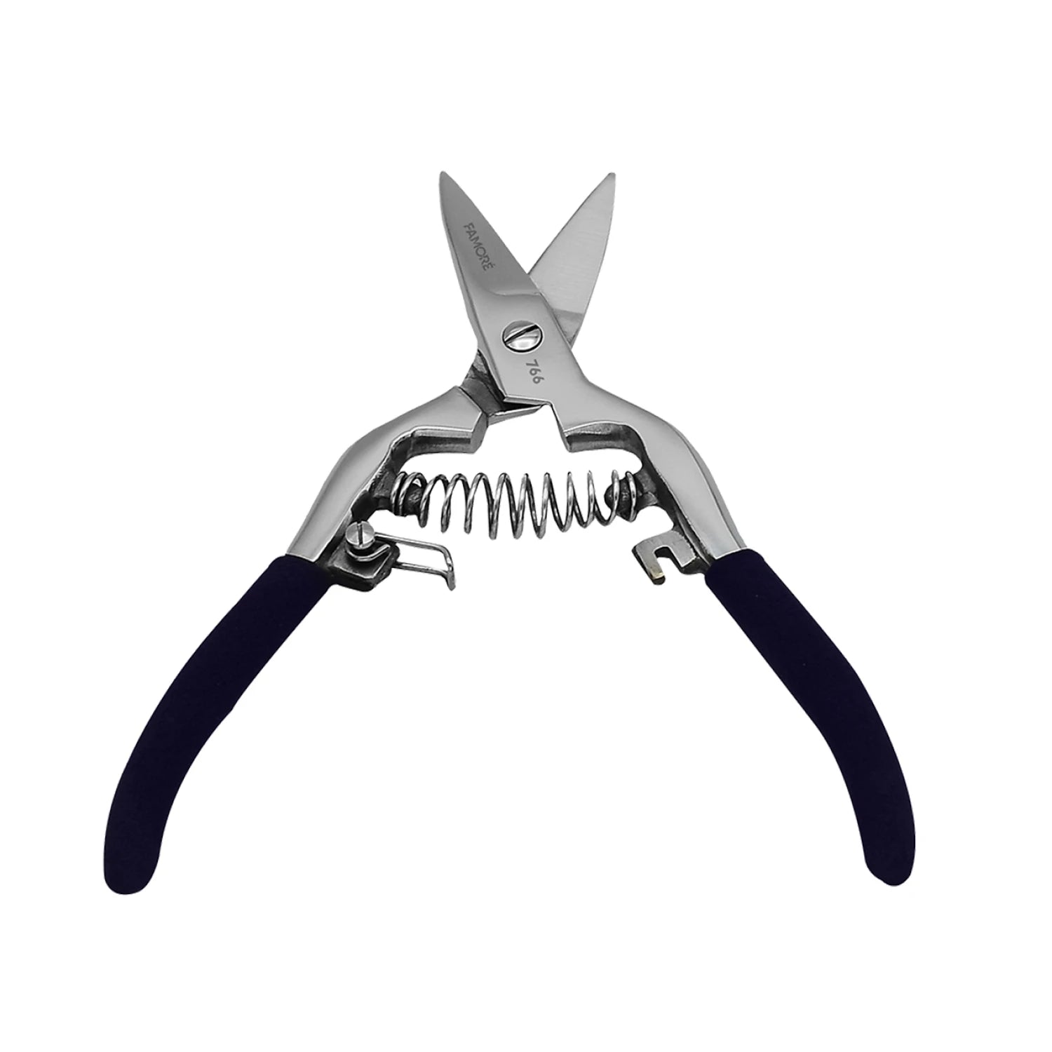 Famore heavy duty German stainless steel; 55 to 58 Rockwell hardness. 2-1/4in blade length and a serrated bottom blade. This ergonomic scissor is great for the heavier fabrics used in home decor drapery and upholstery. Squeeze the comfort foam grip spring lock and the scissor will open by itself.