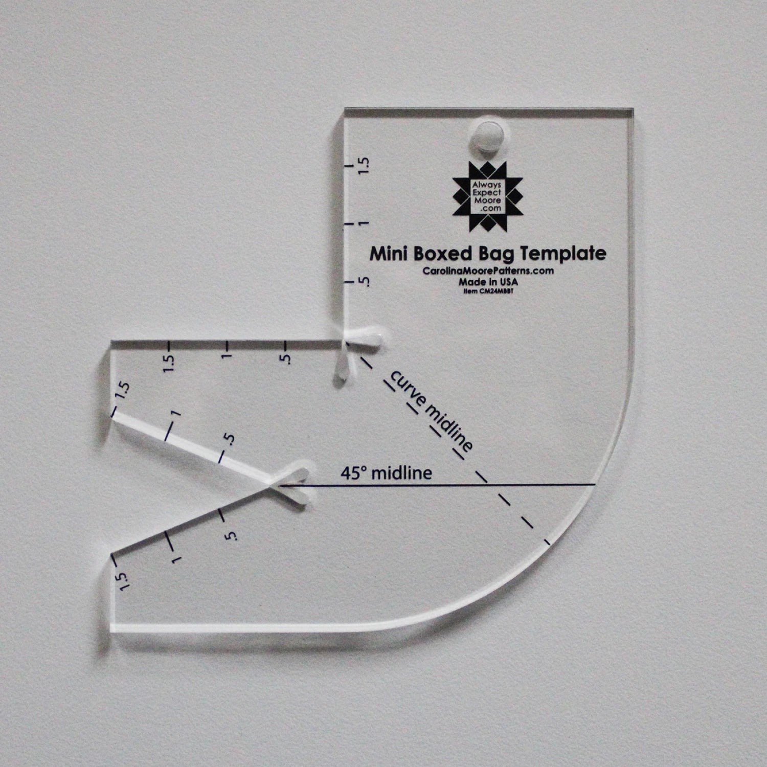 The Mini Boxed Bag Template works with existing patterns requiring boxed corners up to 2" and darts up to 2 1/2".