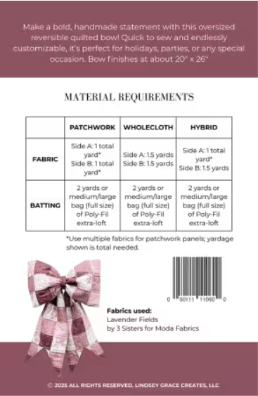 The Big Giant Quilted Bow Sewing Pattern is designed to be both shop-friendly and customer-ready. This professionally printed 5.5" x 8.5" booklet (approx. 20 pages) includes clear, beginner-friendly instructions and illustrations for creating a bold, quilted bow in three different style options—with the ability to make it fully reversible for even more creative possibilities. The project is beginner-friendly, quick to sew, and makes a striking statement piece for holidays and special occasions.